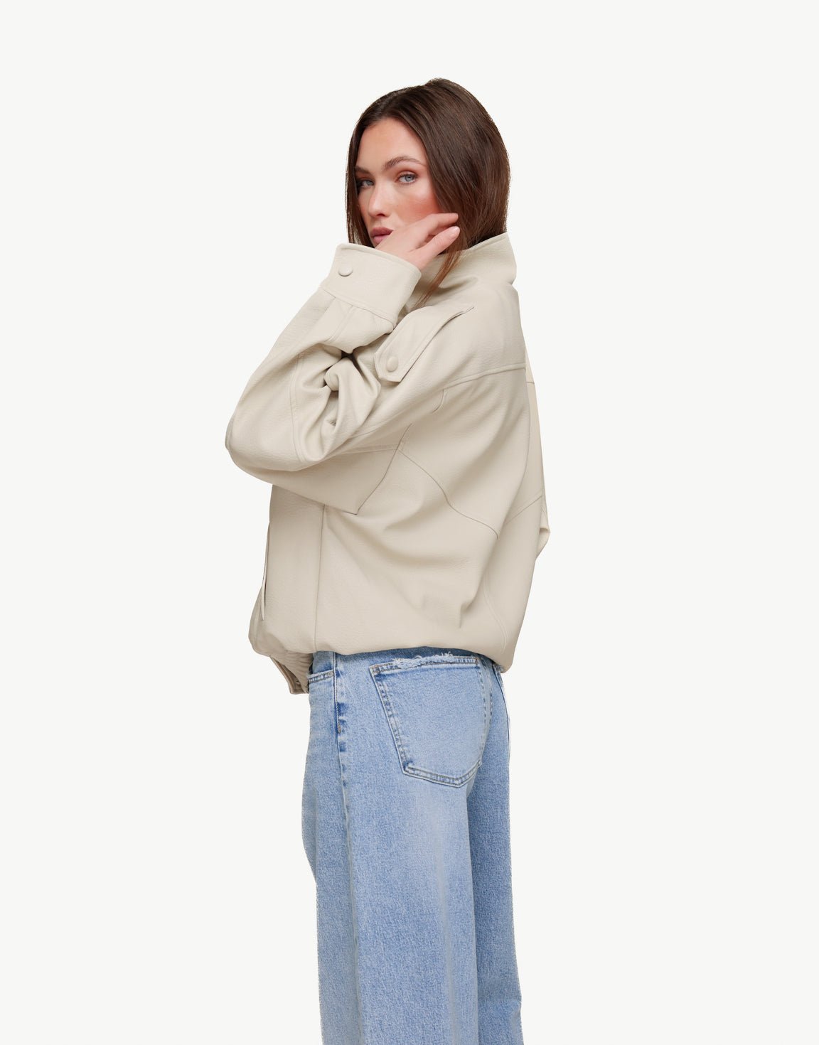 Beige PU Leather High Collar Jacket